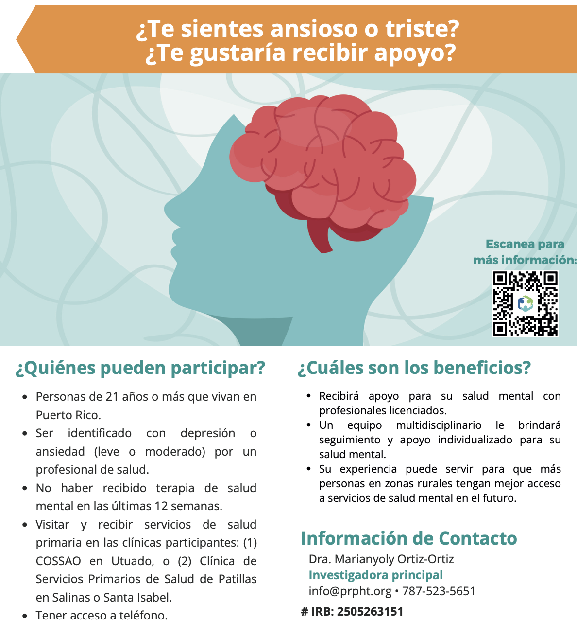 Este estudio busca mejorar el acceso a servicios de salud mental en zonas rurales y desatendidas de Puerto Rico, mediante la implementación del modelo de Atención Colaborativa (CoCM). Se ofrecerán servicios por telesalud y de forma presencial, según la clínica, para evaluar la eficacia del modelo colaborativo en ambas modalidades. El estudio también analizará la efectividad clínica, el acceso, la utilización de servicios y la viabilidad del modelo a largo plazo.